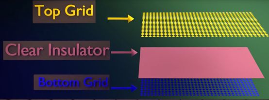 这类触控屏也可以分为三层,上层为纵向联通的菱形块是打印成型的导电玻璃,组成上电极板。中间是一层隔离层,不能导电。下层则为横向联通的菱形块,也是打印成型的导电玻璃,组成下电极板。这三层材料只是为了示意并不是真正的有颜色,他们都是透明的。三层透明材料叠在一起形成电容器。如图。