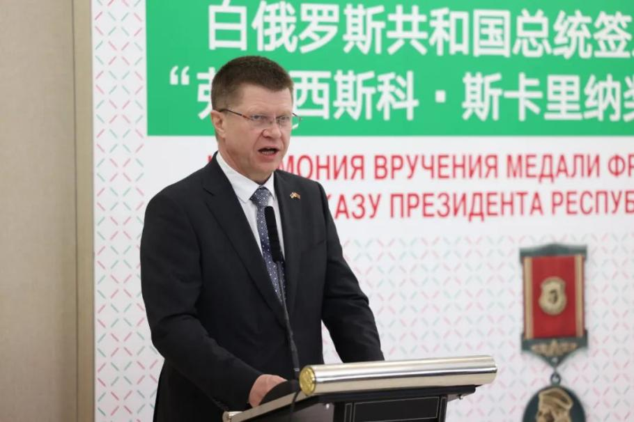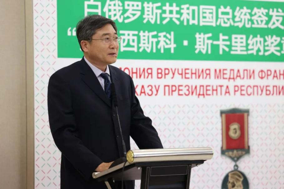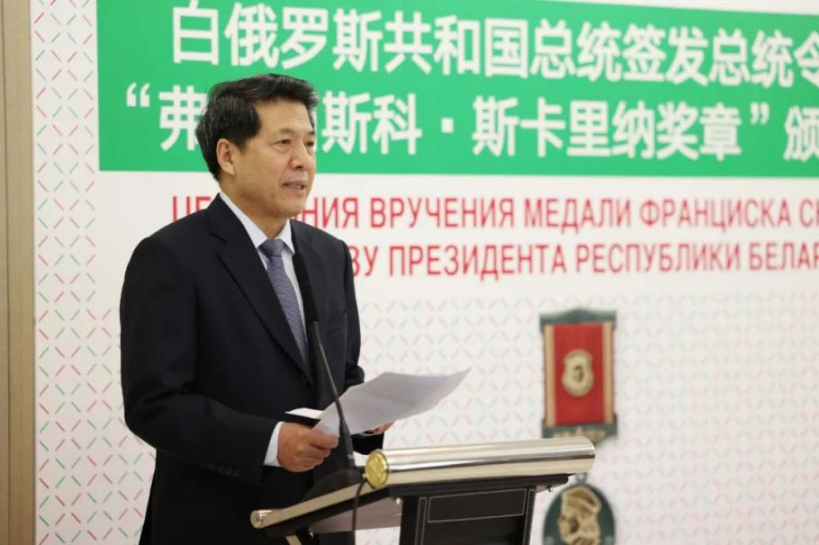 李辉在致辞中表示,中白文艺界始终保持密切沟通交流,促进了双边友好关系持续,为两国民心相通搭建起坚实桥梁。卢卡申科总统决定向吴为山颁发“弗朗西斯科·斯卡里纳奖章”,既是白方对吴为山长期致力于促进中白合作的隆重表彰,也寄托了中白双方以建交30周年为契机,不断拓展人文交流合作的共同愿望。