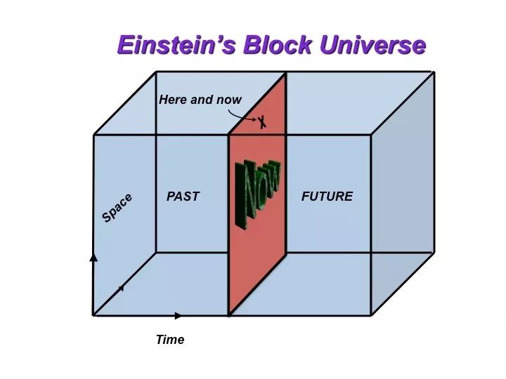 那么在块宇宙中,对一些人来说是未来的事在另一些人看来其实是过去,这要取决于观察者的位置和运动状态。未发生的事件对另一些人来说已经发生。未来对于你来说可能是未知数,但却早已成定局。爱因斯坦自己是这样描述的:“对我们这样相信物理的人来说,过去、现在和未来之间的差别只是一种顽固而持久的错觉。”