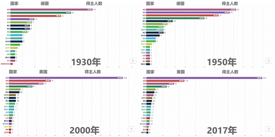 不同年代获得诺奖的人数和国别统计,注意30年代的美国和2000年后的日本,来源:https://www.bilibili.com/video/av28338495/