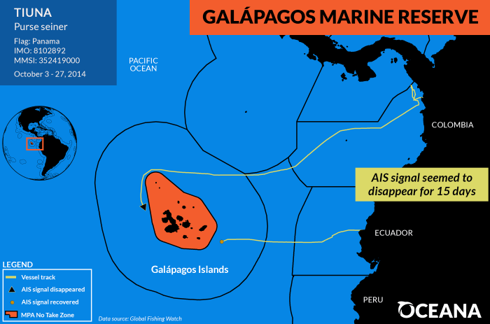 专家使用Global Fishing Watch来识别船只似乎关闭其跟踪系统的事件。他们似乎是在进入海洋保护区的时候这样做的,因为这里禁止捕鱼活动。除了在进入加拉帕戈斯海洋保护区时消失的巴拿马船只外,Oceana的分析师还深入了解了“数以百万计的事件”,以确定另外三艘被认为具有类似可疑行为的船只。