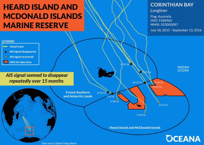 2014年,一艘在巴拿马旗下航行的渔船在进入储备区时关闭了追踪系统,仅在十五天后重新启动,一旦达到另一边。这艘船是由华盛顿特区非营利组织Oceana发现的,该公司不知疲倦地对抗海上有害人类行为。 Oceana的数据科学家团队挖掘了数百万条记录,以确定可能故意隐藏位于受保护海域的船只的船只。