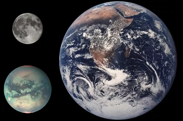 地球、月球、土卫六大小对比,土卫六平均直径约5149公里,是月球的1.5倍。来源:NASA