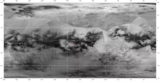 卡西尼成像科学系统(ISS相机)选取了中心波长938纳米波段制成的全球反照率地图(全球分辨率大约在4公里/像素)及部分区域命名。来自2014年8月7日卡西尼号T100次飞掠土卫六获取的影像。来源:PIA20713和PIA19657。