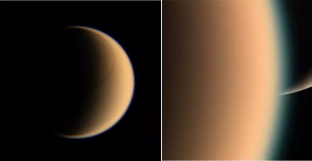 卡西尼号成像科学系统(ISS相机)红、绿、蓝波段合成的影像,近乎自然的肉眼观看效果,可以看到土卫六的底层大气是不透明的橙色,而高层大气则是薄而透明的浅蓝色。(左)宽角相机拍摄于2007年1月28日,距离土卫六约19.6万公里,PIA08879;(右)窄角相机拍摄于2005年12月26日,距离土卫六约2.6万公里,PIA08351