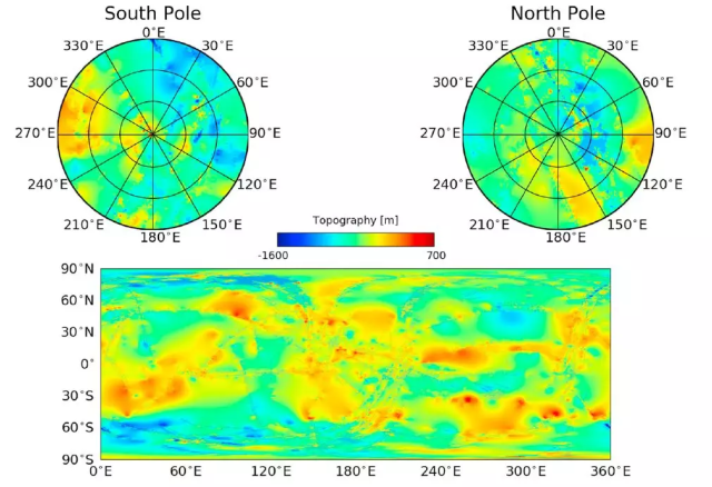 土卫六全球地形图,参考面为土卫六海水面所在的大地水准面,全球分辨率1°×1° 。来源:[4]
