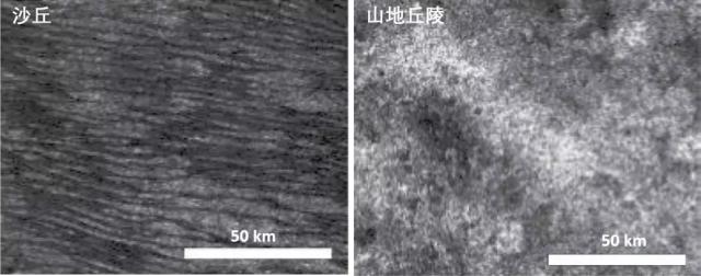 土卫六上的沙丘有点儿像地球上的线性沙丘,主要以条状平行延伸的形式出现,大多有1-2公里宽,80-130米高,数百公里长,间隔在1-4公里之间[5, 6]。