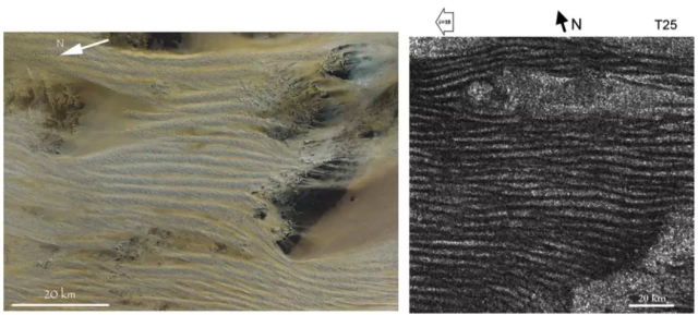 (左)利比亚的线性沙丘(可见光影像)和(右)土卫六的线性沙丘(雷达影像)。来源:参考文献[7]