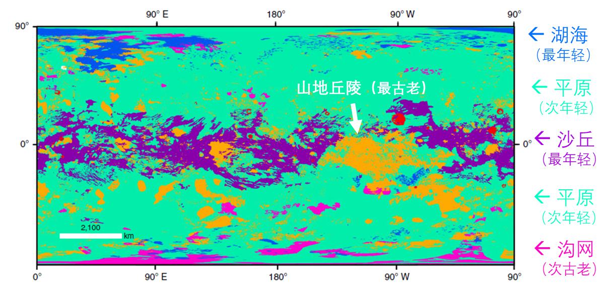 各个纬度都有分布的山丘最古老;其次古老的是聚集在南极的沟网;再次是主要分布在中纬度的平原;位于赤道的沙丘和位于北极的湖海最年轻,但因为两者的分布没有任何交切,所以判断不了到底哪个更年轻。