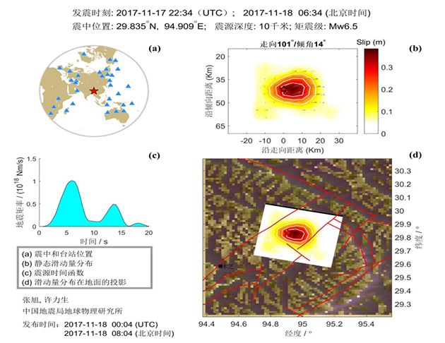 根据中国地震台网测定,北京时间2017年11月18日06时34分在西藏自治区米林县(北纬29.75度,东经95.02度)发生6.9级地震,震源深度10公里。截止到2017年11月18日11点30分,2人受轻伤,1人被滚石砸中,另外1人是在疏散过程中腰部扭伤。