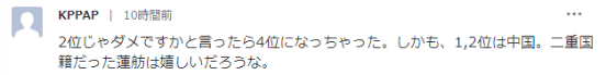 不想做第2却排在第4了。第1和第2都是中国,现在双重国籍的莲舫应该很开心。(译者注:莲舫,日本民进党前党首,具有华裔背景,因此屡遭日本网友攻击)