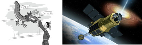 图1:(左)画龙点睛的成语故事;(右)卫星“瞳”的想象图(来自于JAXA网站)