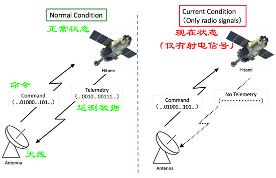 在发现卫星部分部件解体之后,JAXA本来想利用随后卫星过境的机会和卫星进行通讯联系,对卫星发送传输指令和接受遥测数据,从而了解卫星究竟发生了什么。但是,截止3月29号之前,仅仅只接收到过总共6次来自望远镜的极短信号,并没有望远镜的其它观测以及状态数据,所以没有办法确认卫星的健康状态。在3月26日和3月27日分别两次,每次接受到的信号时长大约在几分钟,但是到了3月28日和3月29日时,每次的信号时间减少到只有几秒钟。
