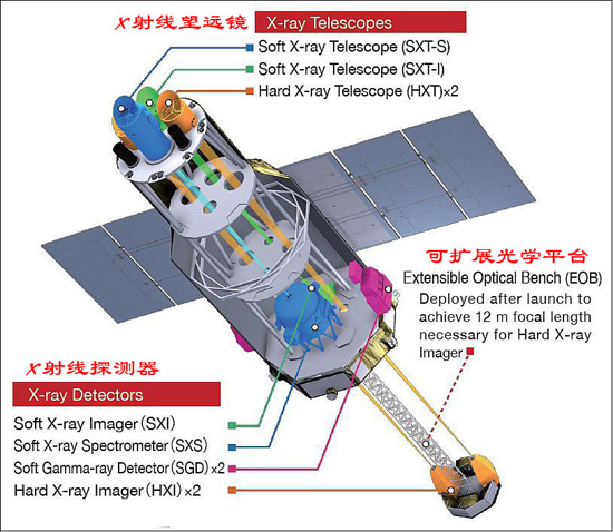 另外一部分就是探测器系统。不同的探测器分别用于探测被不同望远镜所收集到的X射线光子。它包括软X射线成像仪(Soft X-ray Imager),软X射线光谱仪(Soft X-ray Spectrometer),硬X射线成像仪(Hard X-ray Imager)。我们可以注意到,因为硬X射线很难聚焦,所以与软X射线探测器相比,它被放置在一个更远的位置上。除这些探测器之外,还有一个软伽马射线探测器(SGD,观测能区40-600keV),它能够监测观测方向上的伽马射线。