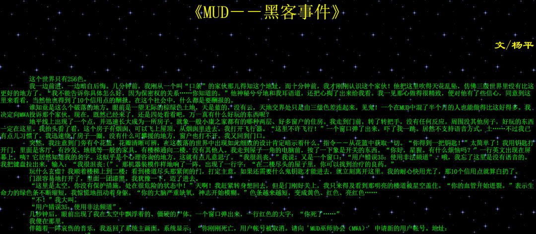 20年前,我曾经在清华大学计算机系培训中心当教员。当时玩心有点大,工作之余建立了一个文字网游的MUD(Multi-User Dimension,多人即时的虚拟世界)服务器。但是后来因为我的一次操作失误,服务器所有的用户数据全丢掉了,我非常伤心。伤心之余,我创作了一部科幻小说,叫做《MUD-黑客事件》。